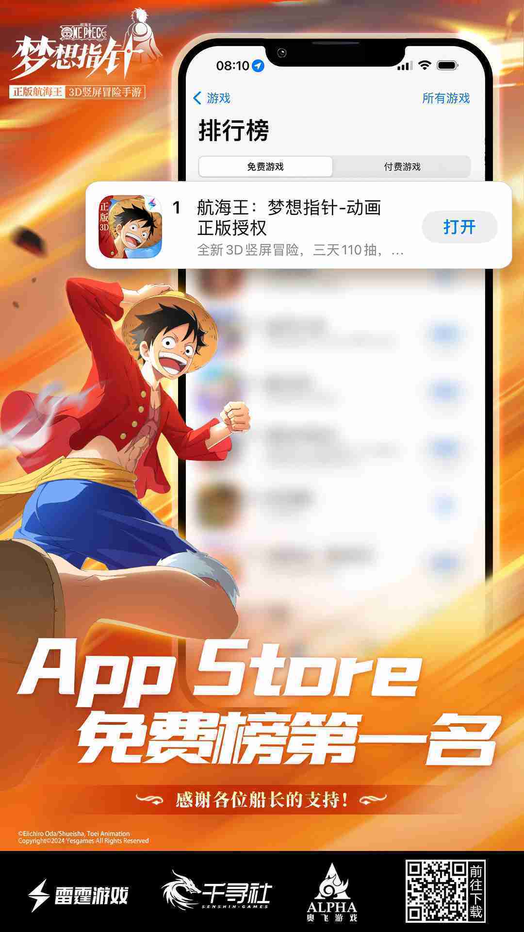 产品新闻 《航海王:::梦想指针》登顶App Store免费榜,,公测福利汇总!!!