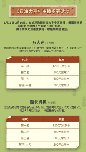 除了“油王”争霸赛,,,,精英主播招募活动亦同步开启!!赛事分时长奖和人气奖,,,,奖励同样丰厚!!!