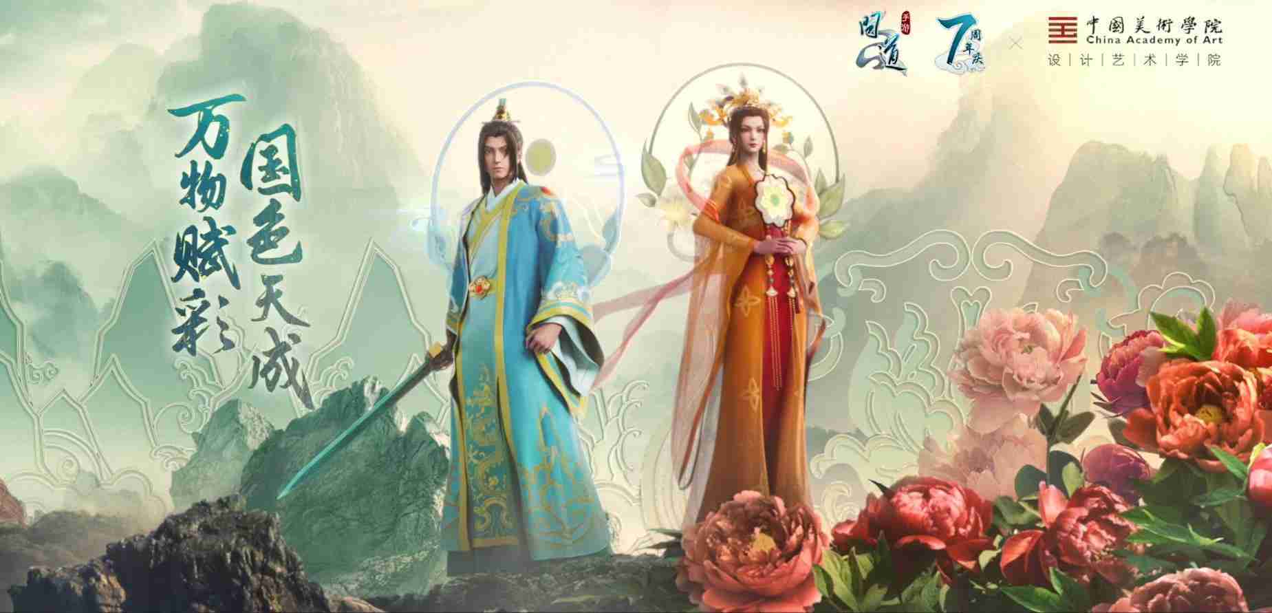 2023年4月,,,,《问道手游》联动中国美术学院,,在游戏中融合了中国历史上不同时期的文化元素,,打造了“山河万象”与“凤鸣九霄”的国风时装。。。在色彩配置方面,,,创作团队基于对游戏角色特性的分析提取相应的文化内涵,,,从每一种色彩的色相、、、、指代事物和情感出发对应角色属性,,,,选定服装的色彩搭配。。。。在纹样设计方面,,,,创作团队结合游戏角色自身特殊的造型比例和形态,,在实际的纹样设计中进行了游戏语境下的活化演绎。。。男性角色集中使用了如蟒纹、、海水江崖纹、、如意纹和云气纹等传统纹样元素,,,女性角色则吸纳了凤凰纹、、、、牡丹纹、、、、卷草缠枝纹等元素,,,组成以“双凤牡丹纹样”“缠枝牡丹纹”“金玉凤冠头饰”为主要纹样的游戏角色装饰图案系统。。